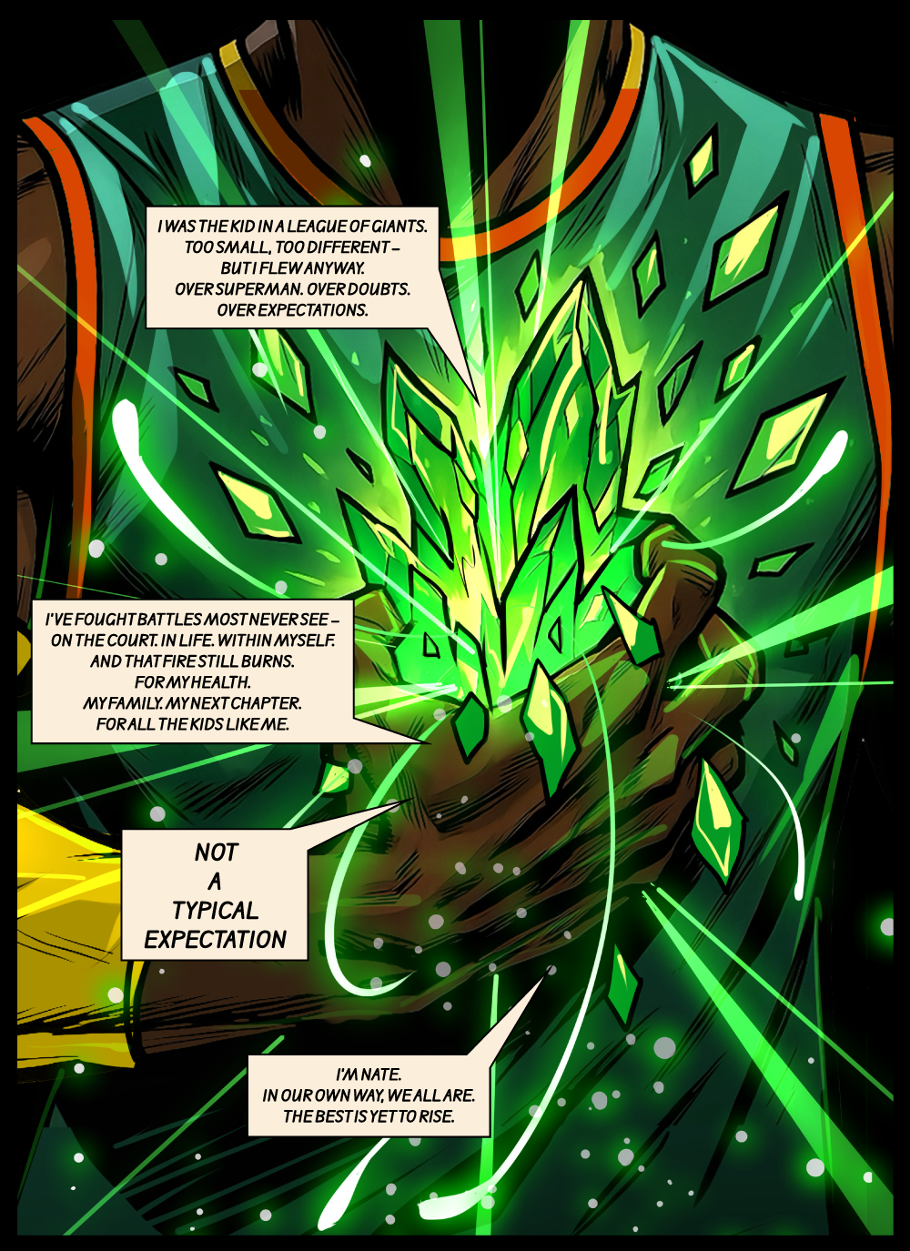 Underscoring the pack is "N. A. T. E. — Not A Typical Expectation," the mantra that has powered Robinson since day one. At just 5'9", he stormed a league built for giants and proved that heart, grit, and imagination can shatter any ceiling.